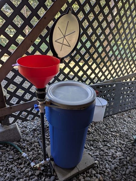 U2N2 Bioreactor: Urine is introduced into the funnel at the top and travels to the bottom of the barrel. It then passes up through biochar where nutrients are adsorbed onto the biochar substrate. One guild of bacteria breaks the urea down to ammonium which is then converted to nitrite and then nitrate by two other guilds of bacteria. Denitrifying bacteria then convert the nitrate to harmless nitrogen gas (N2).