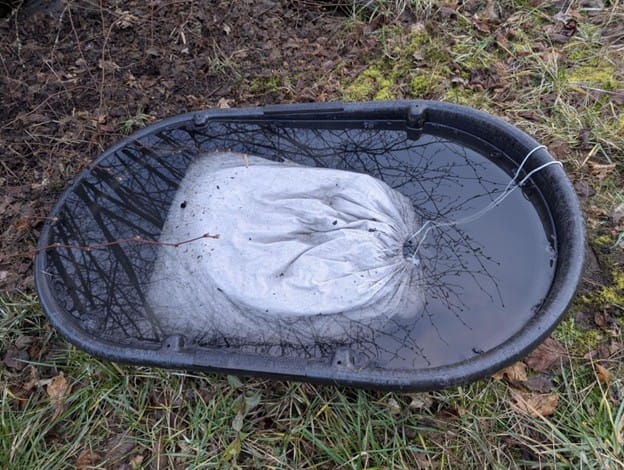 Biochar Bag: This bag full of biochar is undergoing testing before being deployed in a freshwater pond to mitigate harmful algal blooms.