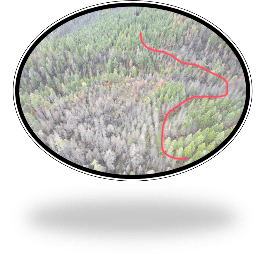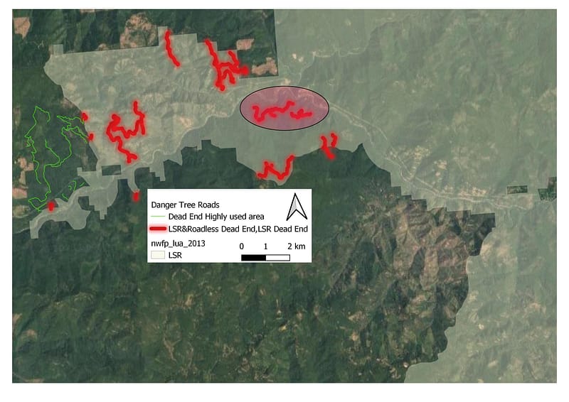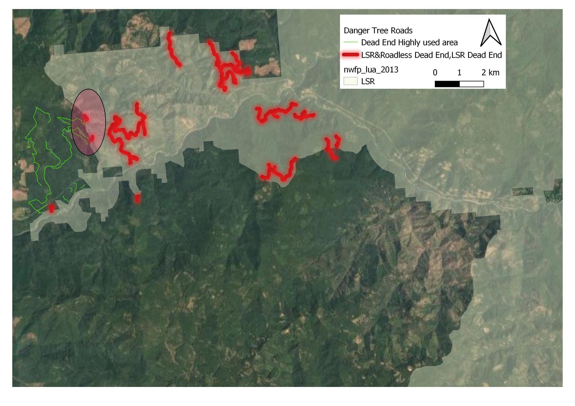 Area of danger tree removal. Dead end roads and Late Successional Reserve. Drone photo of circled area below.
