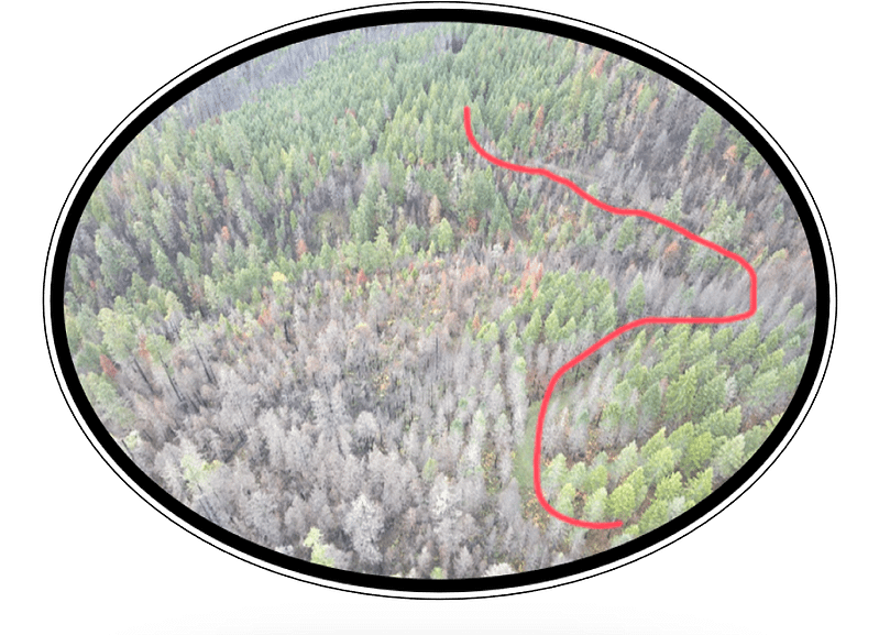 Drone photo of danger tree removal proposed along dead end road in Late Successional Reserve. Red line is approximate location of road.