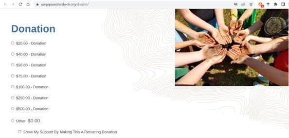 A suggestion at the banquet came from Alysia Gaye to make your donations monthly. This is a great way to help the organization by providing a stable and reliable source of income. Shortfalls in funding can shift our time and resources from programs to fundraising. The good news is that there are several ways to do that. Our donation page at umpquawatersheds.org/donate has a check box where you can indicate a recurring donation. You can make this weekly, monthly, quarterly, or yearly.