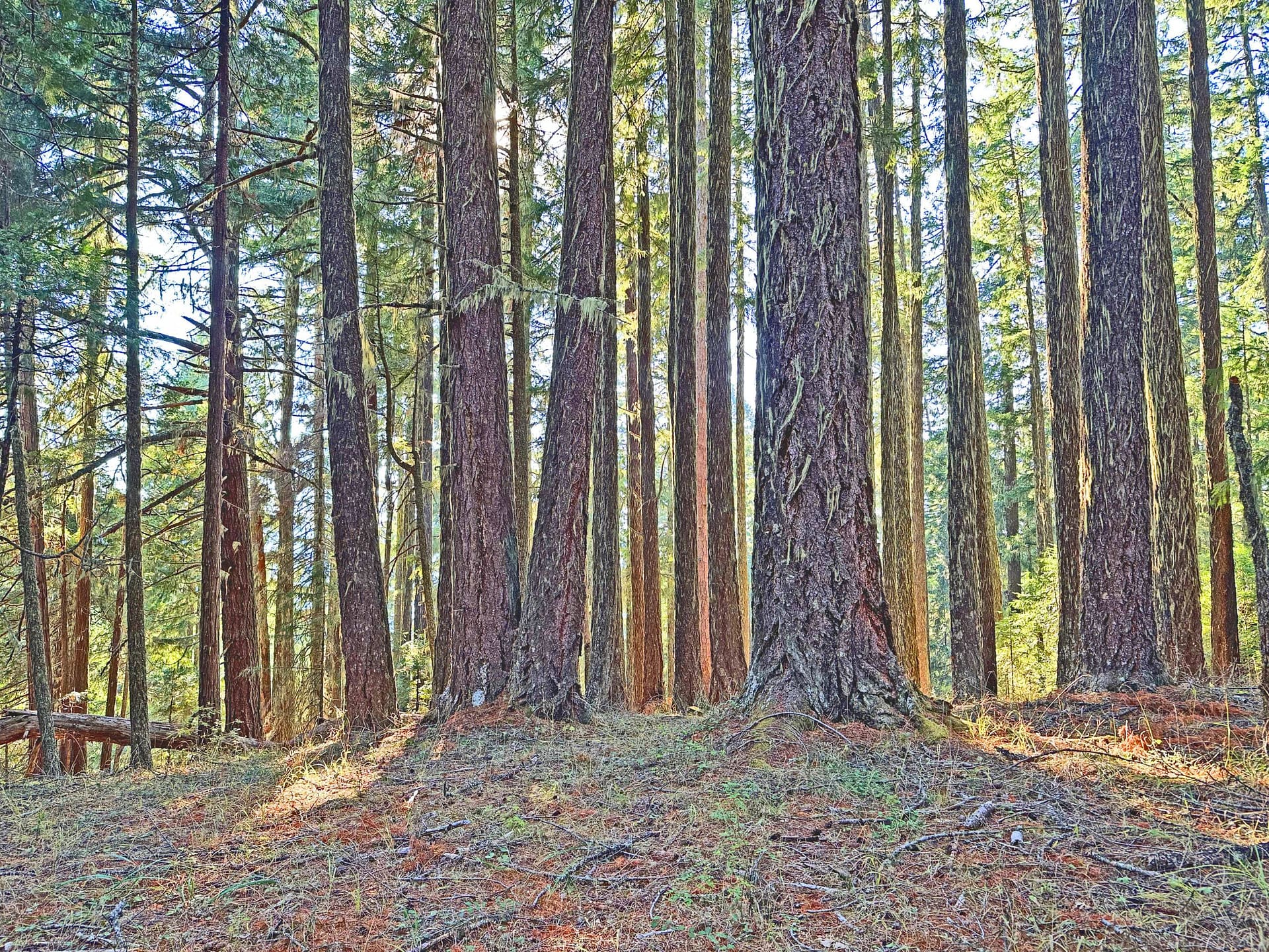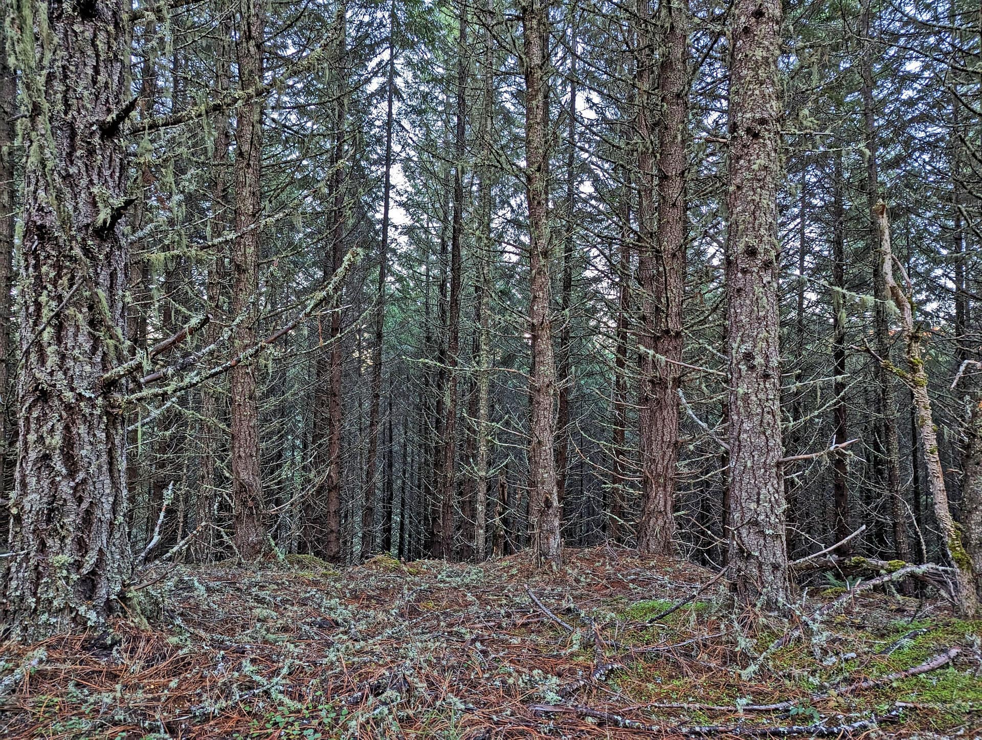 Even though there is typically more biomass in a native forest, the structure of their fuels makes plantations burn more severely. Old-growth forests are cool and moist, providing double the stream flows of plantations1. Large, widely spaced trees with uneven heights, thick bark, and separated crowns are highly resistant to wildfires. These older forests commonly exist as islands on public lands that were also heavily clearcut and replanted in rows a few paces apart beginning in the middle of the last century. Stand on any viewpoint in the public/private BLM “checkerboard,” and 60-80% of what you see will be carpets of plantations.
