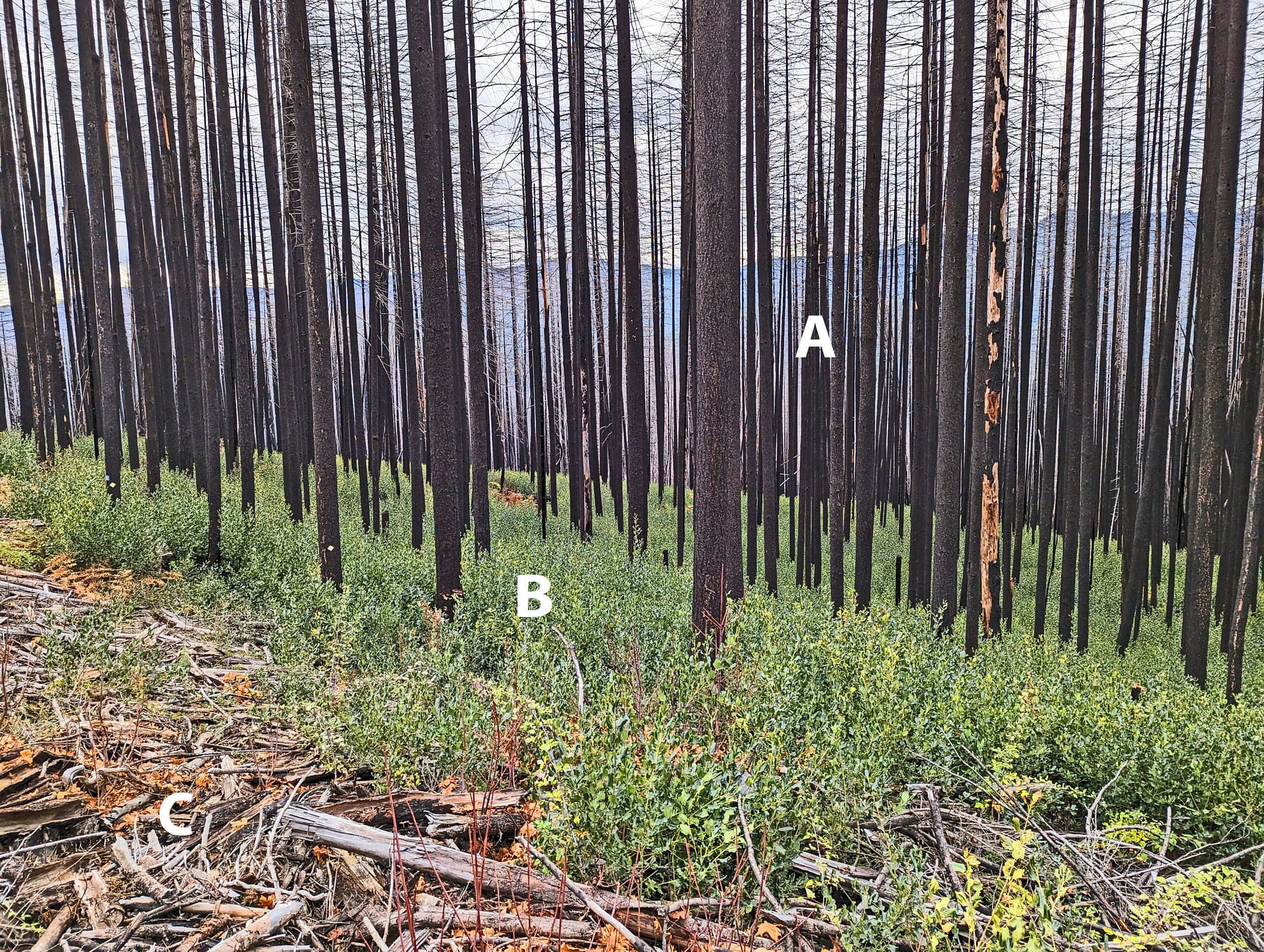 FIGURE 2. A 50-60 year-old plantation stand burned in the Archie Creek Fire. Note: (A) the minimal amount of remaining fine fuel available for a future crown fire, (B) the heavy shrub layer dominated by nitrogen-fixing Ceanothus species enriching the soil in the understory, and (C) the heavy layer of fuel in the foreground left from salvaging the adjacent stand.