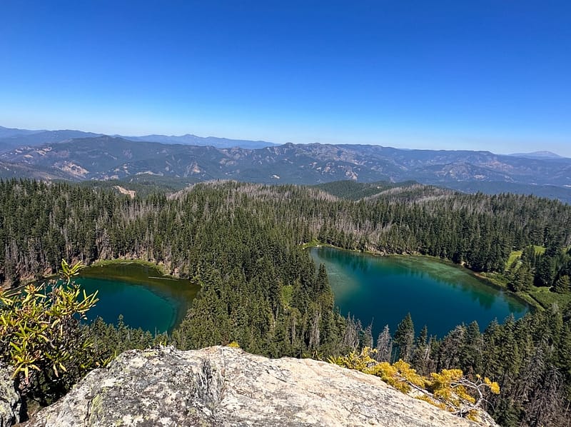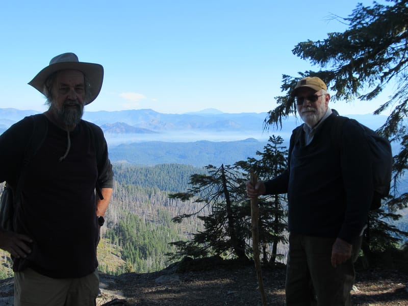 It was a beautiful fall day to spend at Twin Lakes for the 17 happy hikers for the first joint hike with Umpqua Watersheds and Friends of the Umpqua Hiking Club. The hike in is an adventure itself with the spectacular old growth forest and views to the Cascades of Diamond Peak, Thielsen, Bailey and Crater Lake Rim. The Fire Weed has gone to puffy seed. I spotted a dainty bleeding heart plant and the last of the asters. The view from the cliffs was as absorbing as always. The colors and reflections of the lakes changed as the light moved and shifted. An enchanting place which is in the Crater Lake Wilderness Proposal so that it will be designated the highest protection possible to keep it pristine. Diana